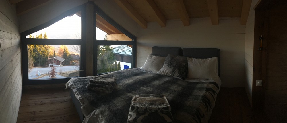 Chambre orientée plein Sud avec vue imprenable sur les Alpes valaisannes pouvant accueillir une à quatre personnes avec lit box spring 180cm et une extension où l'on peut retrouver 2 fauteuils qui peuvent, au besoin, être transformés en lit deux places de 160cm ou deux lits simples. Nous recommandons cette chambre pour les familles avec enfants.