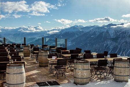 La terrasse ensoleillée d’environ 120 places offre un merveilleux panorama sur les Alpes, notamment le Dom, le Weisshorn et la Dent Blanche.