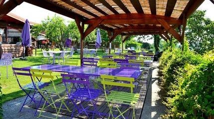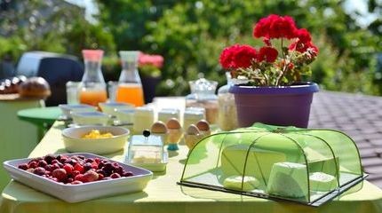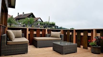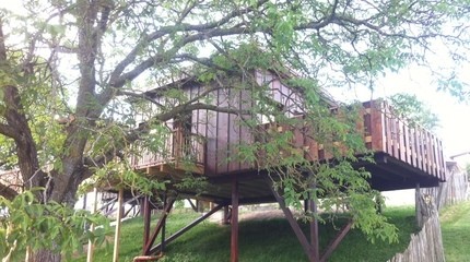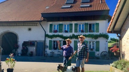 Deux cabanes luxueuses perchées dans les noyers et un studio indépendant dans la ferme. Ferme extensive de 40 ha avec élevage de genisses, cultures fourragères, blé, maïs et activité de loisirs verts inclus dans le prix des chambres. Accueil exclusif à la ferme par Michel et Christophe. Chambre double: le studio, chambre luxueuse au rez-de-chaussée de la ferme, indépendante. 1 lit double et 1 lit simple, cuisinette, douche. Salle de bain/toilette séparée, coin à manger. Une terrasse devant la ferme et une terrasse privative dans le jardin potager. Petit-déjeuner exclusif et activités swin-golf et minigolf inclus ! Prix CHF 90.-/personne identique toute l'année !