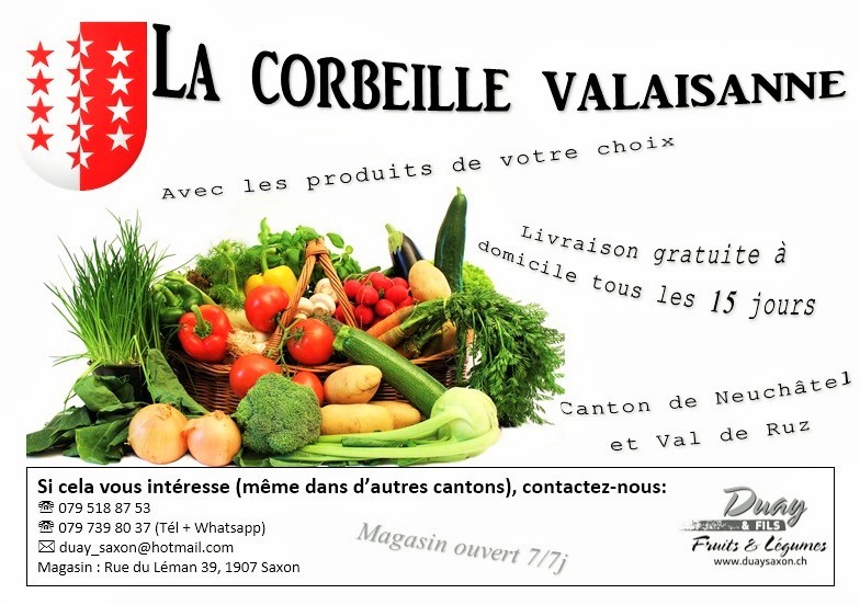 Pour ceux qui souhaitent recevoir des produits frais directement chez eux, nous offrons un service de livraison bihebdomadaire. Il est possible de choisir parmi nos fruits, légumes, et autres produits du terroir pour créer votre propre corbeille Valaisanne. La livraison est gratuite, et nous déposons les corbeilles directement devant votre porte.