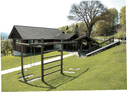 Devant la ferme, en plus d'une vue idyllique sur une partie de la Vallée de Delémont et sur ses montagnes boisées environnantes, se trouvent une terrasse, une place de jeux, un barbecue et de nombreuses places de parc a disposition.