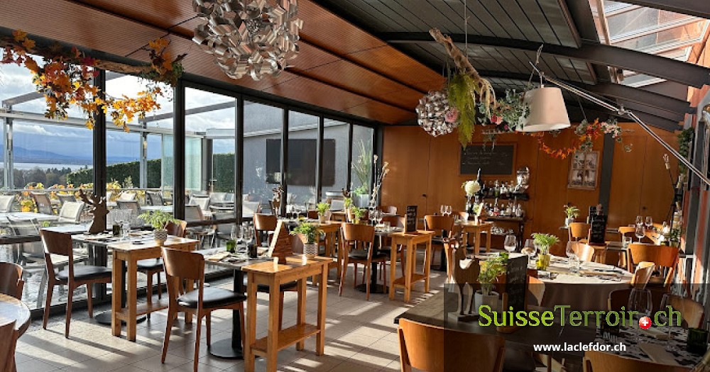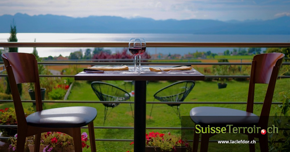La terrasse et la véranda du restaurant permettent de profiter du panorama exceptionnel sur le lac Léman et les vignes.