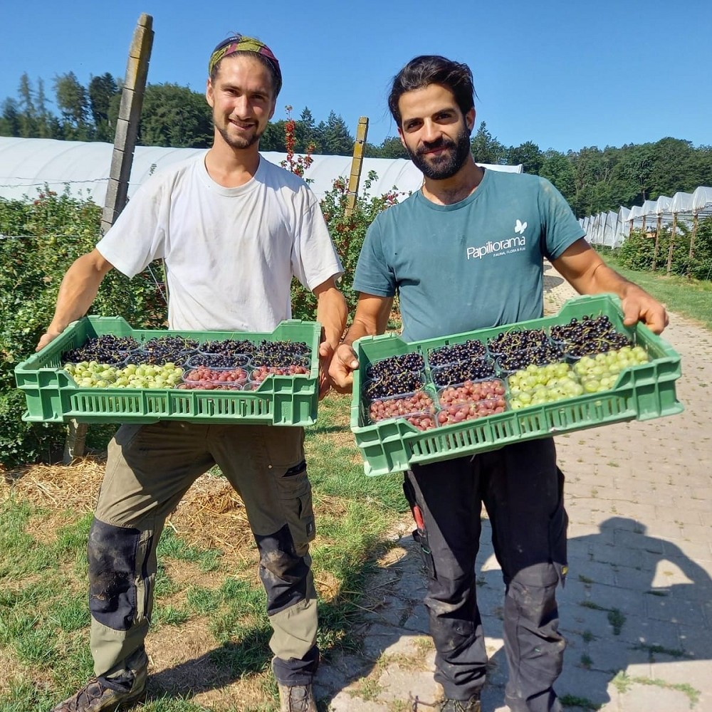 La ferme est située à Chésopelloz, près de Corminboeuf, et comprend 8 hectares de cultures. Elle est notamment constituée de vergers de pommes, poires et pruneaux de 3 hectares, vieux de 4 générations. Une partie du verger est protégée par un filet anti-grêle installé il y a 25 ans ; son remplacement est imminent. Les 5 hectares restants sont cultivés en petits fruits (fraise, framboise, myrtille, mûre…), en légumes (tomate, salade, carotte, patate douce…), en fleurs et en herbes aromatiques. Un demi-hectare est sous tunnel. Cela nous permet d’échelonner la production sur les saisons pour la vente directe et d’avoir une production hivernale. Nous disposons encore de chambres froides et d’une cave, ainsi qu’un pressoir pour fabriquer du jus et deux tracteurs. Loin des axes routiers, la ferme s’est développée en vente directe diversifiée : marchés en ville, magasin à la ferme et auto-cueillette, livraison de paniers en Sarine et en Gruyère.
