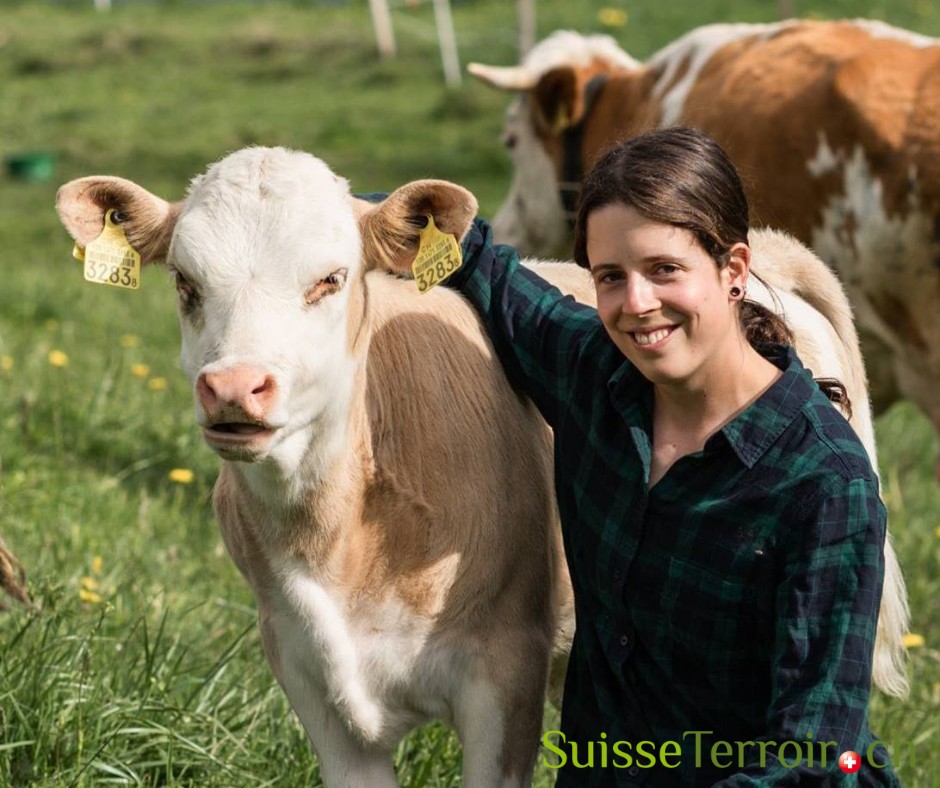 Notre troupeau de vaches allaitantes Hinterwälder, une race alpine rustique et réputée pour être la plus petite vache d’Europe, est élevé dans le respect de traditions ancestrales. Les veaux restent avec leur mère tout au long de leur croissance et sont nourris uniquement à base d’herbages naturels. La viande produite est d'une qualité exceptionnelle, avec une texture fine et persillée. Nos bœufs sont abattus localement à Farvagny, à environ 18 mois, garantissant une viande de bœuf locale et savoureuse.