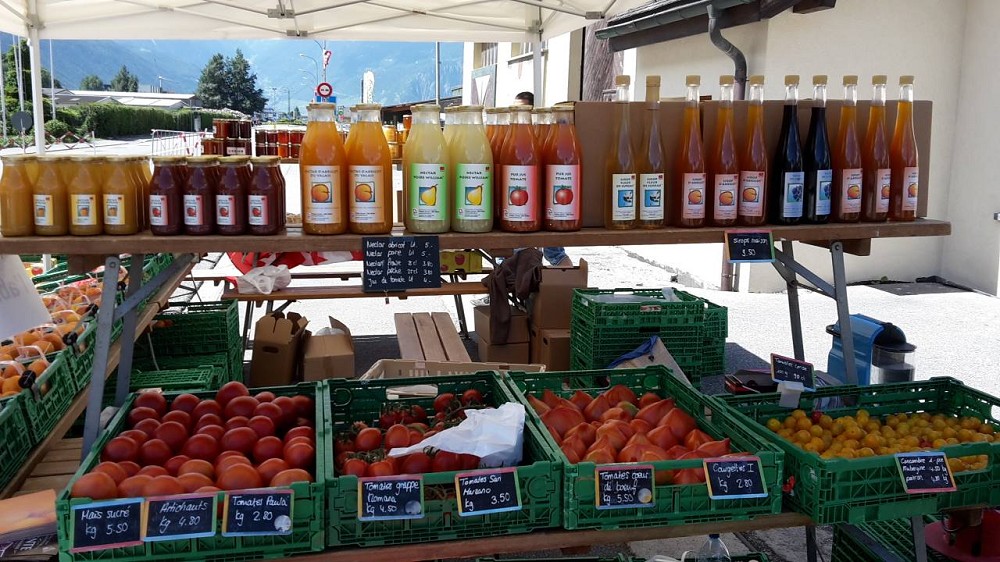 Tous les fruits et légumes en vente chez nous sont produits au domaine (sauf parfois des pommes de terre et des pommes qui proviennent du frère de Philippe, Pierre Dorsaz, ou d’un autre agriculteur local).
