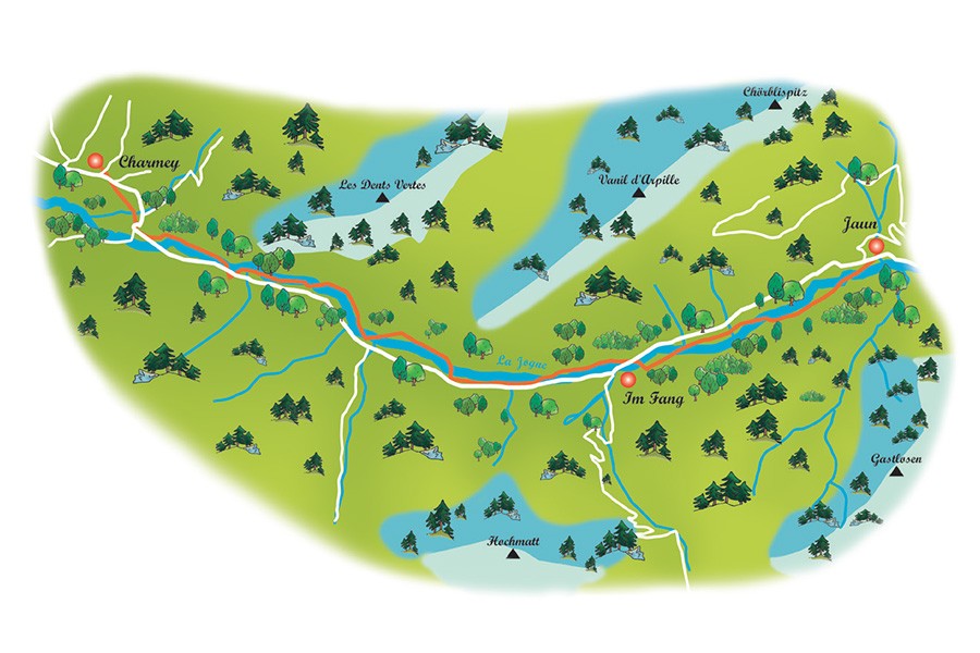 De Charmey, on suit la Jogne, cette rivière qui donne son nom à la vallée. On longe les berges au travers de petits bocages qui apportent ombre et fraîcheur. Coup d’oeil imprenable sur une formation rocheuse qui date de l’ère glaciaire et où l’on devine encore un ancien ermitage. Bucolisme de la rivière aujourd’hui endiguée mais qui, longtemps, fut infranchissable et crainte par la population locale pour ses crues subites. Traversée d’un superbe biotope, règne des batraciens, grenouilles et autres crapauds. À Im Fang, poursuivre le chemin en amont du restaurant en direction de Jaun, belle vue sur les Gastlosen, une chaîne de montagne à la découpe impressionnante. Arrivée à la cascade de Jaun, une impressionnante chute d’eau de 12 mètres qui surgit de la montagne et centre cosmo tellurique bien connu. Retour possible en bus.