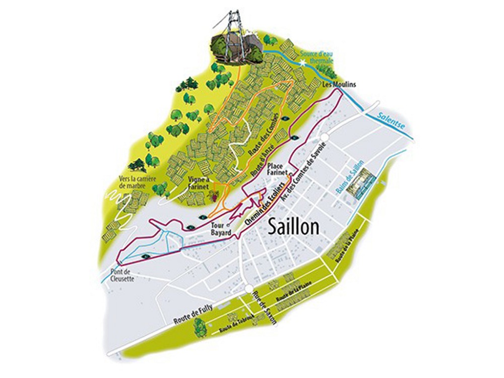 Sise au débouché des gorges de la Salentse, la petite cité romaine de Saillon déménagea sur la colline durant le Moyen Age. Entourée d’une enceinte encore visible, la bourgade est dominée par les ruines du château et par l’emblème de Saillon, la tour Bayard, elle-même protégée par le rempart ouest aux demi-tours caractéristiques.