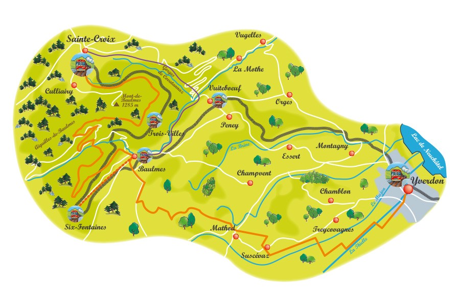 Le transport des vélos est gratuit dans le train. Possibilité d’en louer à la gare de Sainte-Croix (024 455 43 30).