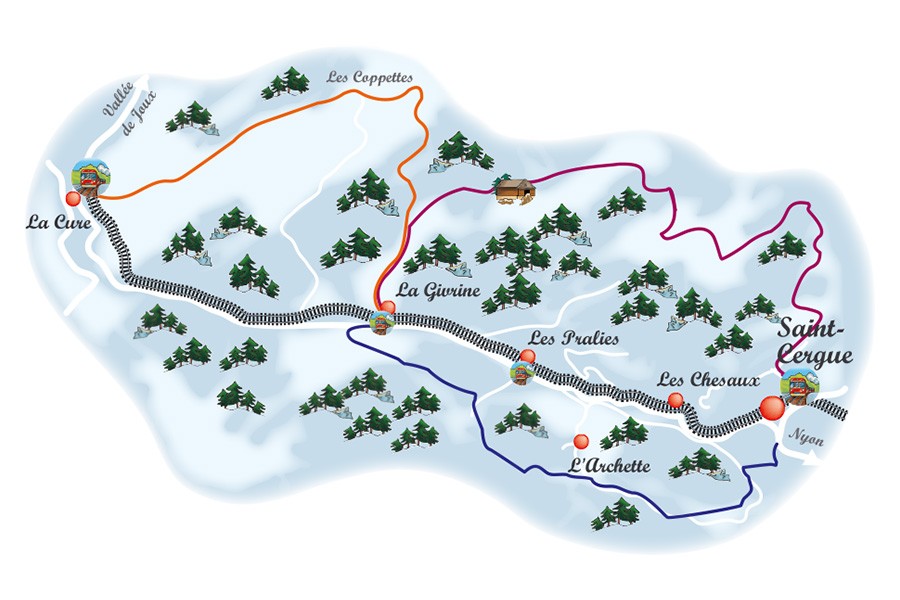Saint-Cergue, l’Archette, Couvaloup de Saint-Cergue, La Givrine. Itinéraire balisé, 2/3 du parcours sur piste damée. Vue sur la Dôle, Poêle-Chaud et la chaîne du Jura. Itinéraire alterné entre pâturage et forêt. Possibilité de prendre le train aux Pralies.