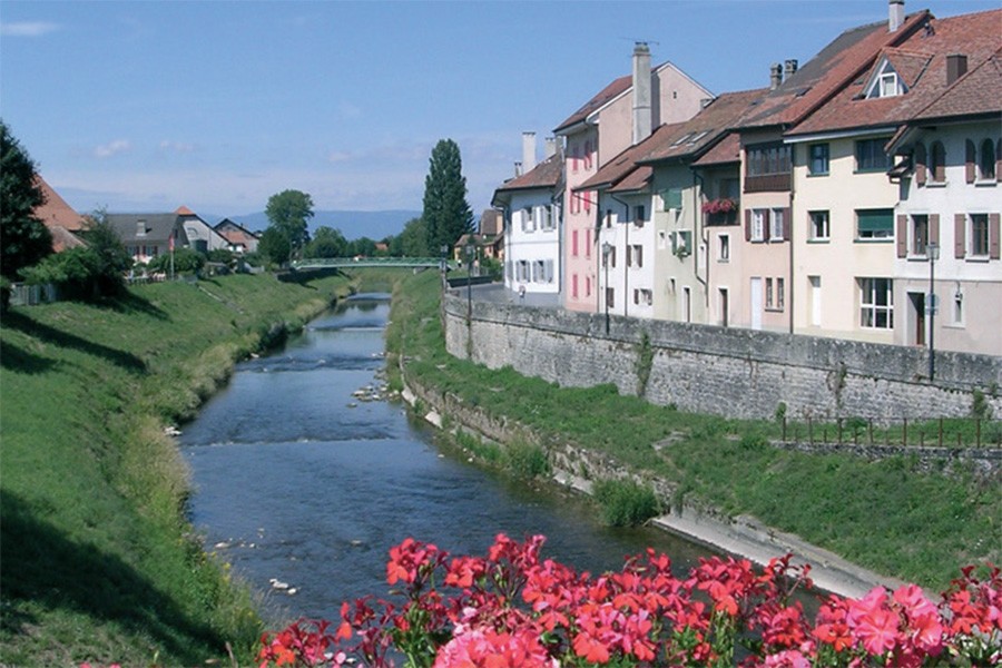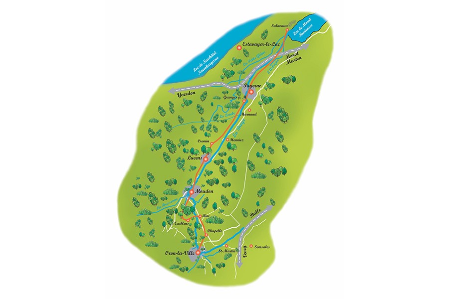 Après une visite au Château d’Oron, longez la forêt, un coup d’oeil sur les préalpes fribourgeoises et prenez la direction de Chapelle, son église mérite une halte, longez la route sur Gillarens et Blessens pour arriver au Château de Rue. Après le village d’Ecublens, prenez sur Villangeaux, un arrêt à la chute de Chavanette s’impose. En direction de Bressonnaz, ralliez Moudon par le chemin du Château de Sépey. Une visite attentive des vieux quartiers de Moudon qui constituent un véritable bijou d’architecture. Les bords de la Broye vous conduiront à Lucens où les passionnés d’histoire pourront s’imprégner des vieilles pierres de l’ancien bourg. Empruntez le chemin au bord de la Broye et n’oubliez pas de tremper de temps en temps vos pieds dans la rivière, suivez-la jusqu’aux portes de Payerne : son Abbatiale du XIème siècle, le plus grand monument d’art roman de Suisse, ses musées et ses spécialités de charcuterie vous combleront au terme d’une journée de détente. Poussez jusqu’à Salavaux, là où la Broye se jette dans le lac de Morat. Sur la pente orientale du Vully, vous trouverez des possibilités de promenade sur les grèves sablonneuses du lac, propices aux oiseaux migrateurs ou aux baigneurs selon la saison, ou dans les sapins du Bois de l’Asse, en passant par la lourde terre de la plaine alluviale et par l’étagement des vignes pour rejoindre le sommet du Mont Vully qui offre une vue imprenable.