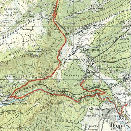 A la Chaux-de-Fonds, on prend le premier bus du matin en direction de la Vue des Alpes (attention : l’autobus ne circule pas tous les jours). Du parking, où se trouve une table d’orientation, on grimpe jusqu’au téléski puis, par un bon chemin qui suit toujours la crête, on atteint la Tête de Ran. De là, la vue s’étend au nord sur les nombreuse chaînes boisées du Jura et, au sud, sur la couronne majestueuse des Alpes. La randonnée se poursuit à travers les pâturages dégagés via Grandes Pradières jusqu’au Mont-Racine. Le chemin bifurque un peu plus loin sur le versant nord, traverse un vallon couvert de prairies et débouche dans la Mauvaise Combe. Il faut suivre la route carrossable sur quelques centaines de mètres jusqu’au troisième virage où l’on descend à droite. Au troisième embranchement à droite, on suit le panneau « Les Tablettes » ; environ 70 mètres plus loin, au lieu de suivre le chemin qui s’engage dans la montée à droite, il faut prendre droit devant le chemin carrossable du haut, continuer en longeant la lisière du bois, puis pénétrer dans le bois et descendre jusqu’à la route que l’on emprunte sur environ 600 mètres. On continue en suivant le panneau blanc indiquant les « Gorges de l’Areuse ». Après le deuxième virage en épingle à cheveux, on prend à gauche un chemin étroit qui descend dans les gorsges. Les randonneurs qui souhaitent s’arrêter là peuvent se rendre à la gare de Champ-du-Moulin, située à quelque 300 mètres par la route. Les autres atteignent la rivière Areuse et la franchissent. Le chemin forestier descend en pente douce jusqu’à une voie carrossable et à une petite station électrique. 500 mètres plus bas, on bifurque sur un sentier intéressant qui est le véritable chemin des gorges et qui passe sur la rive gauche de la rivière, après avoir franchi une passerelle métallique. Les rochers se resserrent pour former un passage étroit. La vue plongeante est impressionnante surtout depuis le petit pont de pierre en arc. La rivière s’assagit ensuite et forme de pittoresques bassins creusés dans les rochers. Au dernier pont, les chemins se séparent : ceux qui retournent à La Chaux-de-Fonds montent jusqu’à la gare de Chambrelien, les autres se dirigent en aval vers la gare de Boudry, située à une demi-heure de marche.