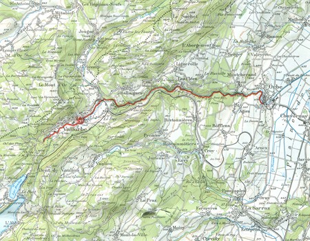 Au moment où l’Orbe débouche d’une grotte, ce n’est pas un petit filet d’eau, mais déjà une rivière qui a un bon débit. On peut visiter la grotte de l’Orbe où les eaux ont sculpté des formes impressionnantes, et observer la rivière dans sa partie souterraine. On quitte la grotte en longeant la rive droite. On contourne l’usine électrique et après la conduite forcée, on reprend le chemin qui longe à nouveau la rive en direction de Vallorbe. On découvre là l’une des particularités de nombreux cours d’eau jurassiens : l’homme a utilisé la force de l’eau pour actionner des roues hydrauliques et des turbines. Vallorbe était autrefois un centre de sidérurgie. Du pont routier, on aperçoit bien l’ensemble compact des usines et des ateliers. Le Musée du fer présente l’artisanat du fer et une forge en activité. On quitte la localité par la route principale en direction de Pontarlier. A 1.3 km, on bifurque à droite pour retrouver l’Orbe dont les eaux sont à nouveau maîtrisées pour actionner une usine électrique. Près du mur de retenue, la vallée s’enfonce hardiment. Les bâtiments industriels et les ruines que l’on aperçoit sur l’autre rive à Le Day témoignent de l’activité qui régnait jadis. On gagne alors le lit encaissé du ruisseau, jonché de roches tapissées de mousse. A proximité du chemin, on aperçoit des arbres rongés par les castors. Ayant franchi la rivière près de la petite usine électrique, on poursuit désormais l’excursion sur la rive droite, par une série de galeries et de tunnels n’offrant aucune difficulté. On arrive bientôt au pied de l’imposant château fort des Clées qui domine le petit village situé de l’autres côté du rocher. On passe ensuite sur le pont et l’on suit sur une petite distance la route qui mène à La Sarraz. A l’endroit où la route quitte le bois, on oblique à gauche pour prendre un chemin carrossable plus étroit qui se transforme peu à peu en un sentier de randonnée solitaire. En restant toujours à mi-hauteur dans l’ombre fraîche du bois, ce chemin assez long, mais de foulée agréable, conduit au petit lac de retenue situé à proximité de la petite ville d’Orbe. Du pont, le regard plonge encore sur l’Orbe qui se précipite en grondant en bas d’une marche raide. Là encore, les ateliers et les usines que l’on aperçoit utilisent la force de l’eau. On ne terminera pas cette excursion sans une promenade à travers cette ancienne cité.