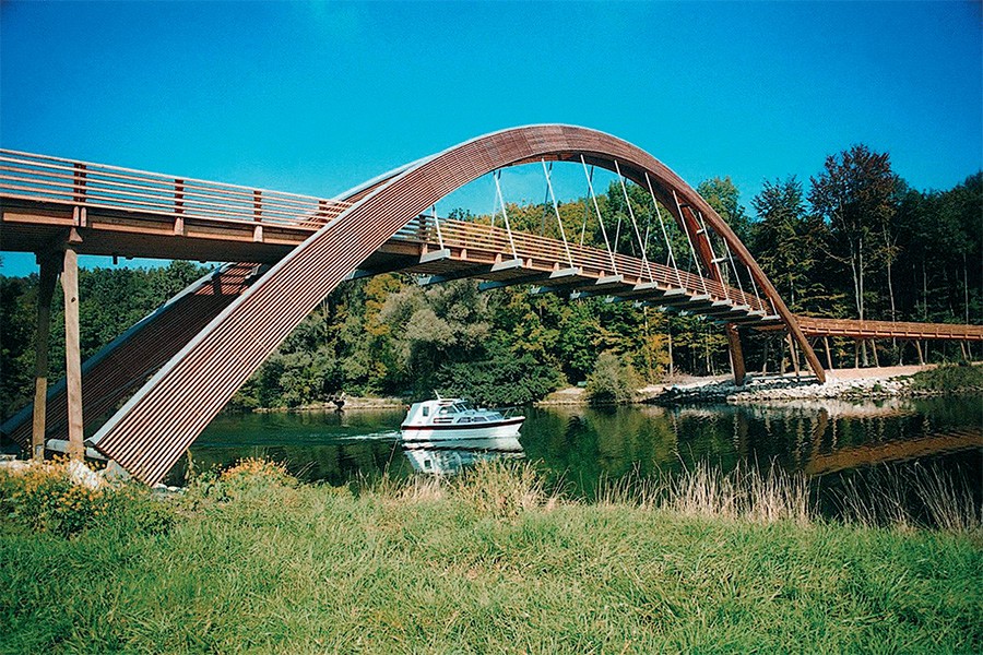1. Sous le pont, suivez le chemin pédestre vers la droite jusqu’au camping «Les Trois Lacs». Vous pouvez alors franchir le Pont Rotary, joyau architectural en bois qui a été construit pour l’Expo.02. Choisissez la rive droite ou gauche pour la fin de votre promenade jusqu’ au centre-nature ASPO de La Sauge.