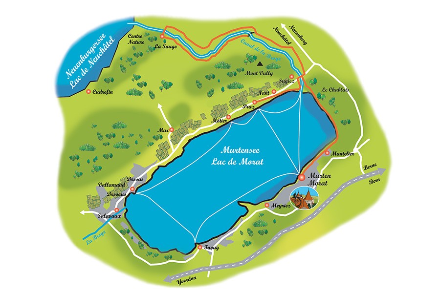 2. Franchissez le pont à Sugiez et empruntez le chemin pédestre en direction du lac, continuez le long de la rive nord du lac de Morat jusqu’à Praz (embarcadère).