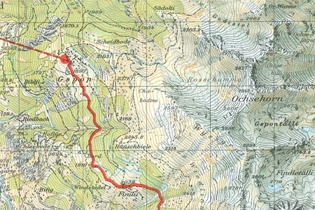 La première partie de cette splendide randonnée est dominée par le Balfrin, auquel se succèdent peu à peu le majestueux dôme de l’Allalinhorn et le groupe des Mischabel. Gspon, hameau tranquille, sans voitures, habité toute l’année, est le point de départ de la randonnée. On y accède par la télécabine au départ de Stalden. A la pension « Alpenblick », on descend vers la partie la plus ancienne du village et l’on suit le chemin balisé en blanc-rouge-blanc. Après avoir traversé un bois de mélèzes clairsemés, on arrive à Finilu. Là on doit monter, mais on ne tarde pas à retrouver un chemin agréable qui se poursuit presque à plat, en suivant par moments un « bisse » (canal d’irrigation à découvert). On se trouve effectivement dans la région de Suisse la plus aride, avec des précipitations annuelles d’environ 50 cm (env. 115 cm à Zürich), et sans apport artificiel d’eau, il n’y pousserait pas grand-chose. Le chemin continue dans un décor varié, tantôt à travers bois, tantôt à travers champs, franchissant parfois de petits ponts au-dessus des entailles que les torrents ont creusées dans la roche. On atteint finalement le point culminant de la randonnée (2271 mètres) vers Färigen et les enclos à bestiaux. On trouve les derniers mélèzes et pins arolles à une centaine de mètres plus haut seulement. Outre un refuge (fermé), il y a aussi à Färigen une petite fontaine et un emplacement pour faire du feu. La vue se dégage de plus en plus vers le sud et s’ouvre bientôt sur l’Allalinhorn qui apparaît peu à peu dans toute son immensité. A partir de là, le parcours en descente est parfois entrecoupé de remontées assez raides, mais courtes. Le chemin passe par un sommet dénudé puis retrouve l’ombre d’un bois de mélèzes et continue à descendre en direction de Heimischgarten. On descend ensuite rapidement vers la vallée, tantôt par l’ancien sentier, tantôt par de petites routes carrossables plus récentes, pour atteindre finalement au hameau Unter dem Berg, richement paré de géraniums, la localité éparpillée de Saas Grund, avec ses anciens recoins pittoresques.