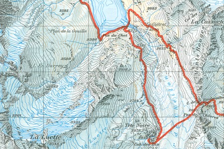 Trajet en car postal à partir de sion. La randonnée offre une vue dégagée sur l’un des plus grands barrages au monde, celui de la Grande Dixence. A hauteur du lac (téléférique), des sentiers pédestres coupent les lacets de la route. Le Val des Dix s’est, en raison de sa topographie, tout particulièrement prêté à la construction de cet énorme réservoir d’eau. Le randonneur emprunte la route longeant la rive ouest d’où l’on découvre le Pigne d’Arolla, le Mont-Blanc de Cheilon et la Luette, culminant tous trois à près de 4000 mètres. Etant donné que le temps est un peu trop juste pour entreprendre l’excursion en un jour, il est recommandé de passer la nuit à la cabane des Dix, magnifiquement situées (146 lits). A cet effet, on emprunte au bout du lac le chemin de montagne qui, passant à l’ouest du glacier de Cheilon, mène en 1¾ à la cabane du C.A.S. Le lendemain, on traverse le glacier (1½ h) pour gagner le sentier du col ; la route est marquée. Ceux qui, toutefois, décident de faire la randonnée en un jour prendront le chemin direct du col. Celui-ci mène, au bout du lac, par un pont suspendu vers les versants des Monts-Rouges, laissant le glacier à droite. Du lac jusqu’au col, situé à 2919 mètres d’altitude, il faut compter environ 1½ heure d’ascension dans un cadre à la végétation de plus en plus clairsemée. Doté de bonnes échelles en fer, le Pas de Chèvres, plus au sud, ne présente pas davantage de difficultés. Au passage du col, entouré de roches et de glace, une vue imprenable révèle le glacier de Tsijiore Nouve et sa langue terminale. La descente côté est se fait par les alpages de la montagne d’Arolla. Laissant le beau Mont Collon à droite, le sentier mène par une forêt d’aroles au lieu touristique d’Arolla (auberges), terminus d’une ligne de car postal en provenance de Sion. La petite route du Val d’Arolla qui conduit aux Haudères traverse une multitude de hameaux, clairsemés entre les bouquets d’aroles.