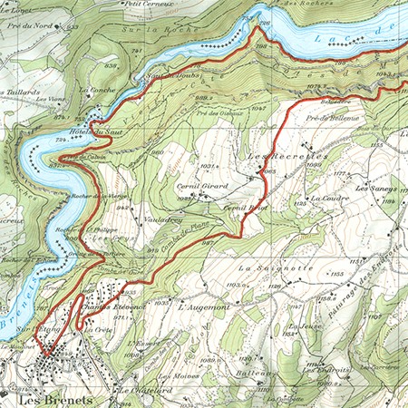 Du lac des Brenets jusqu’à St-Ursanne, le Doubs, la plus grande rivière jurassienne, forme frontière entre la France et la Suisse. L’excursion suite le Doubs dans sa première partie qui est aussi la plus variée. Etant donné que le parcours s’effectue presque entièrement sous bois, cette randonnée est particulièrement recommandée en été, par une journée de grande chaleur. Partant des Brenets, juste derrière le Locle, une petite route bitumée longe le lac naturel jusqu’à l’Hôtel du Saut. Ce parcours offre quelques rares points de vue dégagés d’où l’on découvre un paysage empreint de gravité, à travers lequel la rivière décrit des méandres profondément encaissés dans le calcaire clair. On peut également effectuer ce parcours en prenant le petit bateau. Après l’Hôtel du Saut, la rivière reprend de la vigueur. Ses bords sont jalonnés de rochers couverts de mousse. Le grondement que l’on perçoit dan le lointain annonce la célèbre chute, le Saut du Doubs. Du haut du petit promontoire rocheux, on découvre un spectacle impressionnant : dans un fracas de tonnerre, des masses d’eau déferlent sur une marche calcaire d’une trentaine de mètres de hauteur. En aval, le Doubs forme à nouveau un lac, artificiel cette fois, le lac de Moron. Le chemin suit le mur de la berge sur la rive sud, au-dessus des eaux tranquilles. La masse sombre des sapins qui couvrent les versants de part et d’autre du lac contraste avec les taches claires des affleurements calcaires. On atteint ensuite la petite auberge accueillante du Châtelot, située en contrebas de la retenue. Le soleil se montre quelques heures par an au fond de cette gorge profonde, dont les rives sauvages sont tapissées de mousse. Au retour, on emprunte un chemin balisé en jaune qui commence à grimper 600 mètres environ après la retenue du barrage, et 320 mètres plus haut, on atteint les Roches de Moron. Au parking de l’auberge, on prend la petite route forestière qui se rétrécit ensuite en un petit chemin raide mais sans danger à travers la forêt rocailleuse, en passant par le Belvédère. On suit ensuite la lisière du bois puis, le long d’une haie d’arbres, les traces à peine marquées d’un chemin conduisent à l’Auberge des Recrettes. On regagne Les Brenets par la petite route bitumée.