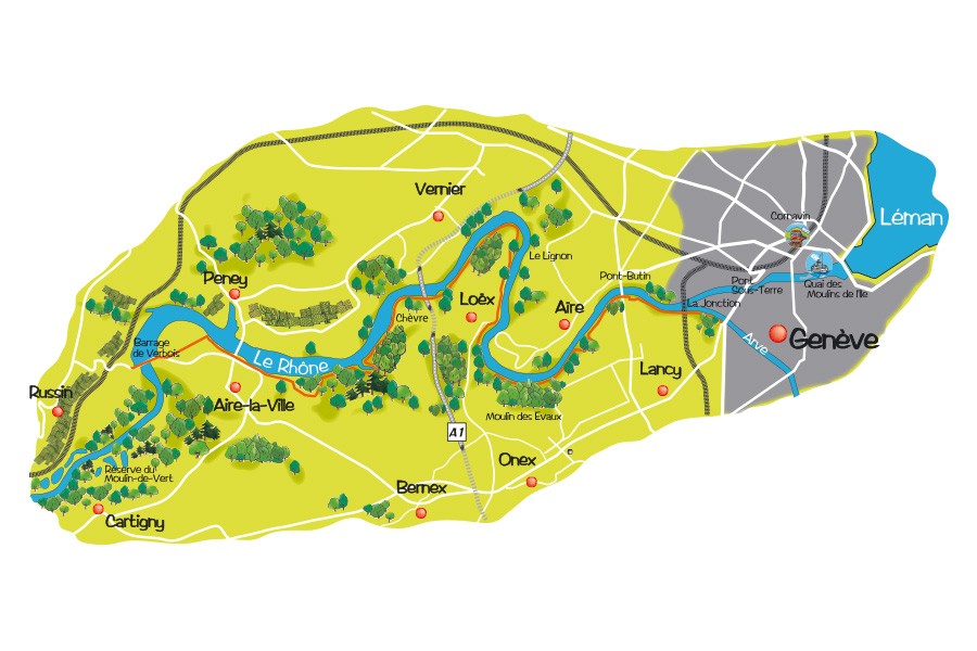 Depuis Verbois, c'est à pied que vous entamez le retour vers la ville. Après avoir contourné la station d'incinération, un chemin de terre battue, non balisé, se rapproche du Rhône et vous conduit aux portes du village d'Aire-la-Ville. Dès le premier rond-point rencontré, suivez les indicateurs jaunes du tourisme pédestre qui vous guideront jusqu'à Genève.