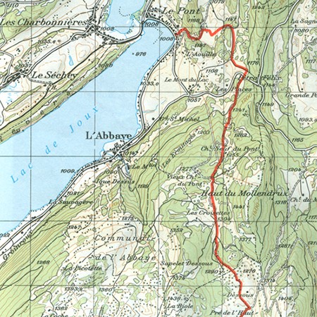Au Pont, on trouvera sur le quai le panneau jaune indiquant le Chemin des Crêtes. La montée s’effectue la plupart du temps par un itinéraire ombragé sur le versant nord. En suivant les marques, on bifurque plus haut à droite, au panneau, sur la petite route asphaltée. Après les grands arbres, on trouve en haut, à droite, un passage dans le mur du pâturage, au-delà duquel on continue à monter à gauche. Le balisage en jaune et rouge existe partout, mais il n’est pas toujours visible de loin. Peu avant Pétra Félix, après avoir traversé la route du Col du Mollendruz, on emprunte la petite route asphaltée, en prenant quelques raccourcis, jusqu’aux Croisettes. Après le portail, on se dirige tout de suite à gauche, puis, un peu plus loin, à droite et de nouveau à gauche au panneau jaune. On atteint ainsi la large cuvette du pré de l’Haut. Là, on suit la petite route jusqu’à ce que l’on trouve des marques signalant la montée à gauche. En suivant les traces d’un chemin balisé, on atteint le chalet d’alpage situé au point 1551, d’où l’on gagne le Chalet du Mont-Tendre où se trouve une buvette. On parvient bientôt au somme dépourvu d’arbres où se dresse la pyramide de mensuration que l’on aperçoit de loin. Le sol jurassien est ici extrêmement mince. C’est à peine si la couche d’humus recouvre les ondulations du calcaire. Un vaste panorama s’offre au randonneur : au nord, le regard embrasse le plus vaste domaine forestier de la Suisse et le Mont-Risoux et pénètre loin en France, tandis qu’au sud se déploie l’ensemble de la chaîne des Alpes. Après la dernière descente, le chemin passe sur le versant nord. Au chalet du Servan, on peut encore voir une citerne munie d’un ancien puits à poulie qui est certainement l’un des derniers spécimens. On emprunte ensuite une petite route en partie goudronnées en suivant toujours les marques jaunes et rouges. Plus loin, le chemin est un peu plus rude, mais il s’’améliore à mesure que l’on se rapproche du col. Le dimanche après-midi, un autobus relie le Col du Machairuz au Brassus (gare).