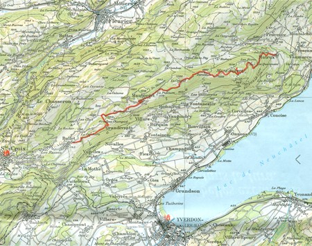 La randonnée commence à Mutrux, à 750 mètres d’altitude (accessible par autobus depuis Yverdon). En suivant le panneau « Mont-Aubert », on monte d’abord par la route asphaltée jusqu’à la forêt. Environ 200 mètres plus loin, on prend à gauche le chemin de randonnée en suivant attentivement les marques jaunes pour être sûr d’arriver en haut. On ne manquera pas de continuer jusqu’au sommet, à 1299 mètres d’altitude, où se trouve une sympathique auberge de montagne. A partir de là commence une agréable balade sur les crêtes d’où l’on jouit, une ou deux fois, d’un vaste panorama. Au Crosat, au lieu de monter en direction de la cabane, on continue en descendant légèrement pour atteindre la petite route qui mène à Mauborget. Ceux qui le désirent peuvent s’arrêter là et regagner Ste-Croix ou Yverdon par l’autobus. Ceux qui sont encore en forme attaquent la deuxième partie et bifurquent à droite, près de la poste, sur un chemin carrossable en direction de Petit Brelingard. Ici, le chemin commence par grimper, puis tourne à gauche à mi-hauteur pour arriver à un mur de pâturage à la lisière de la forêt. On passe ensuite par un tourniquet métallique pour continuer en montant légèrement vers Grand Brelingard. Après la ferme de Granges Champod, le chemin peu visible descend dans la dépression, tourne à droite et rejoint, au coin du bois en haut, un chemin forestier agréable qui conduit à la clairière en pente raide de La Crochère, puis au replat dégagé de Bullet. De là, par temps clair, la vue s’étend sur le Canton de Vaud, depuis le lac de Neuchâtel jusqu’au lac Léman, tandis qu’apparaît, au loin, l’immense crête des Alpes. Un autobus assure liaison entre Bullet et Ste-Croix. D’où l’on peut regagner Yverdon par le train.