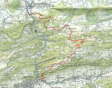 De la gare de Moutier, en suivant le panneau « Raimeux de Grandval », on arrive dans une forêt fraîche et par un chemin étroit on monte régulièrement pour rejoindre une petite route carrossable qui arrive bientôt à une fourche. On s’engage alors à gauche en direction de la combe du Pont. Un panorama exceptionnel mérite bien un petit détour : après la quatrième grange à foin, on bifurque à gauche en suivant les traces d’un chemin en pente douce qui côtoie une étable et arrive à une petite maison de week-end en bordure du pâturage. Un peu en contrebas se dresse un promontoire rocheux d’où l’on jouit d’une vue extraordinaire sur la gorge de Moutier. On revient ensuite près des granges à foin et la montée se poursuit sur environ 300 mètres; après une grande haie plantée d’arbres, le chemin bifurque à droite et conduit aux fermes de Belprahon. En suivant les marques jaunes, on atteint le haut plateau large et dégagé de Raimeux de Grandval. Au petit hameau, après avoir tourné à gauche, le chemin alpestre descend bientôt vers le bois. A la sortie du bois, on bifurque tout de suite à droite. Avant une des cabanes situées à la lisière, en contrebas, on pénètre dans le bois par un passage à peine visible. Quittant à nouveau le bois, on descend tout droit pour rejoindre la petite route carrossable. En se tenant sur la gauche et en longeant toujours le versant à une altitude constante, on retrouve les traces du chemin, parfois peu apparentes, qui mènent au chalet de ski Gitzi. De là, on descend vers Rebeuvelier par un itinéraire bien balisé. Les jours ouvrables, un autobus assure la liaison avec Choindez. On aborde ensuite la seconde partie de la randonnée. En suivant la rue au-dessus de l’église, on passe près d’un terrain de sport avant d’arriver au grand chalet d’alpage de Sur Montchemin. On monte ensuite à travers les pâturages pour atteindre le point culminant à la lisière du bois. Encore quelques pas à travers l’étroite bande forestière et l’on atteint un petit sentier qui se dirige vers la droite en longeant les rochers. A deux endroits du parcours, on peut s’avancer sur un promontoire rocheux d’où l’on a une vue plongeante impressionnante sur la cluse taillée dans les roches gris clair. Le chemin débouche enfin sur une petite route forestière qui descend à Courrendlin.
