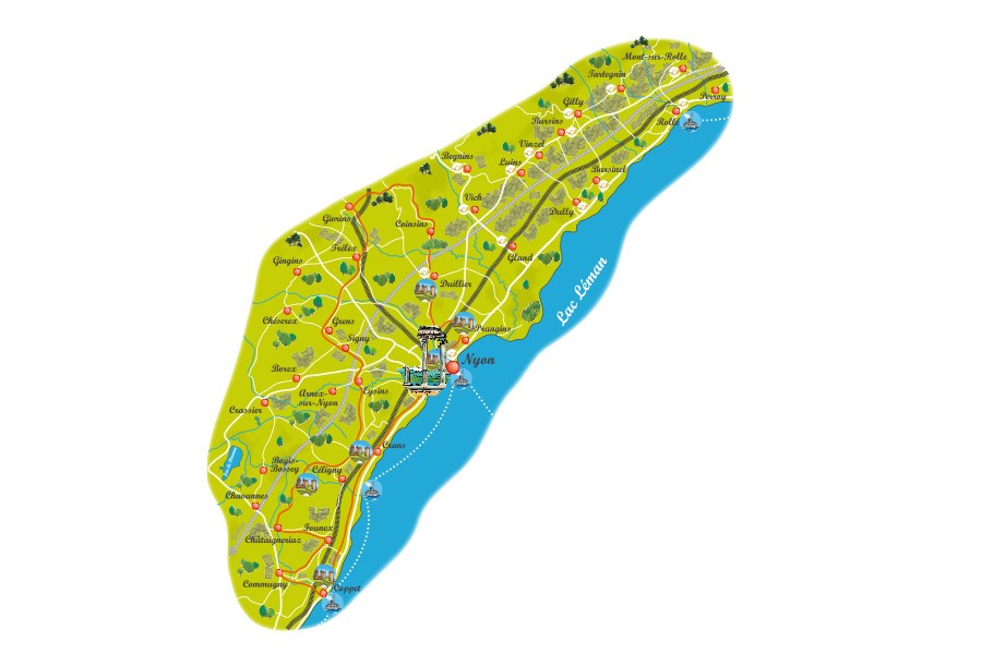 Orientation : plans de région de Nyon et de Terre-Sainte, cartes cyclotourisme disponibles auprès de Nyon Région Tourisme