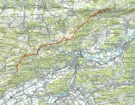 Etant donné que le parcours s’effectue toujours sous bois, cette randonnée est particulièrement recommandée par une chaude journée d’été. Le point de départ est le joli hameau de Bärenwil, situé sur la ligne d’autobus Olten – Langenbruck. Tout le parcours est balisé en jaune et rouge et signalé, à plusieurs reprises, par l’indication « Höhenweg ». Après Asp, le chemin monte par une pente raide à travers bois. Au sortir du bois, à Wuesthöchi, on monte directement vers le panneau indicateur ; de là, il est facile de retrouver la suite du chemin qui mène au rocher de Belchenfluh. Du sommet, par temps clair, la vue s’étend sur la crête des Alpes. On redescend et on suit la petite route carrossable mais non goudronnée jalonnée de plaques commémoratives en souvenir des unités militaires. Près du Challhöchi, on s’engage sur une route où la circulation est interdite et l’on arrive, par une pente régulière, à Hauenstein. Les randonneurs qui veulent s’arrêter là peuvent prendre l’autobus en direction d’Olten. Les autres suivent le panneau « Froburg » et prennent tout de suite à droite, à la lisière du bois, le chemin marqué en jaune et rouge qui monte ensuite à gauche dans le bois et débouche dans une clairière. On continue à monter en longeant la clairière sur la droite. On pénètre à nouveau dans le bois, avant d’atteindre la route carrossable qui mène enfin à l’auberge de montagne de Froburg. De là, on atteint en 10 minutes les ruines de cette ancienne forteresse, déjà abandonnée au Moyen-Age. De l’auberge, le chemin monte jusqu’au grand portail et un peu plus loin à gauche, on bifurque sur une petite route de campagne qui mène sans peine au large passage couvert de prairies, au-dessus de Birmatt. On prend à gauche pour ne pas rater le passage dans la clôture. Après la descente, on commence par suivre la route sur environ 200 mètres, jusqu’à la fontaine, et là, on s’engage à gauche dans la montée. C’est ainsi que l’on atteint, par un parcours peu accidenté, le replat du passage de la Schafmatt. Après l’avoir traversé, on s’engage, près de la cabane des Amis de la Nature, sur une petit sentier forestier, en direction de Geissfluh, d’où lon aperçoit les Vosges et la Forêt-Noire. Le chemin revient et descend jusqu’à Barmelweid, la clinique dem ontagne argovienne. L’autobus pour Aarau part de là ou de Salhöhe.