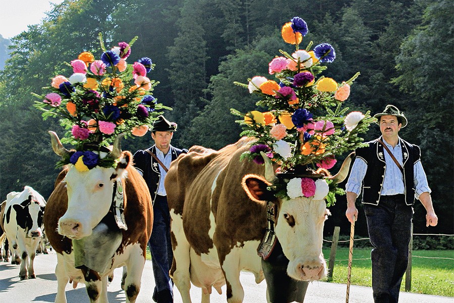 Ce fromage de tradition est toujours réalisé selon le même processus de fabrication depuis ses origines, et impose aux maîtres fromagers un cahier des charges strict, respecté à la lettre. Et personne ne se lasse de le retrouver dans des plats comme les macaronis, les fondues moitié-moitié, ou la soupe du chalet. En Gruyère où il est l’un des fl eurons de la gastronomie, plusieurs coutumes et activités lui sont associées ou dédiées, dignes représentantes de l’héritage ancestral. Parmi elles, les désalpes, dont celle de Charmey, sont des rendez-vous chaleureux et typiques. Rendez-vous au cours desquels chaque alpage propose ses Gruyère AOP révélant au passage les différences subtiles et savoureuses qui existent entre les produits. Pour cette manifestation qui reste un événement incontournable, les participants revêtent les costumes sans lesquels la fête perdrait de son charme: le bredzon pour les armaillis qui ne se déplacent pas sans leur capet, petite sacoche en cuir contenant le sel destiné aux vaches, et le dzaquillon, ancien costume des faneuses, pour les femmes.
