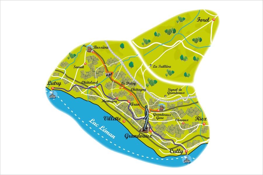 Quittez la halte CFF de Bossière en suivant le sentier balisé en direction de l’est. La traversée du pont de Bory, magnifique ouvrage en pierres taillées de la fin du XIXe siècle, permet d’admirer le bourg de Lutry, ses deux ports et les premières vignes cultivées en terrasses. Mais déjà lac et montagnes s’associent alors au vignoble, pour vous offrir un festin de lumières et de couleurs. Passé le petit hameau du Daley et nichée au-dessus du village d’Aran, la Capite des vignerons de Villette vous invite à la détente. Elle vous propose la découverte des familles vigneronnes du lieu. Quelques pas plus loin, la traversée d’une petite forêt de pins vous plonge dans une ambiance parfumée et méditerranéenne. Mais déjà apparaissent en contrebas les toits serrés du village de Grandvaux et, plus loin, les célèbres parchets du Dézaley. Qui sait?? Peut-être vous inciteront-ils à prolonger votre promenade… Retour à Bossière en train.